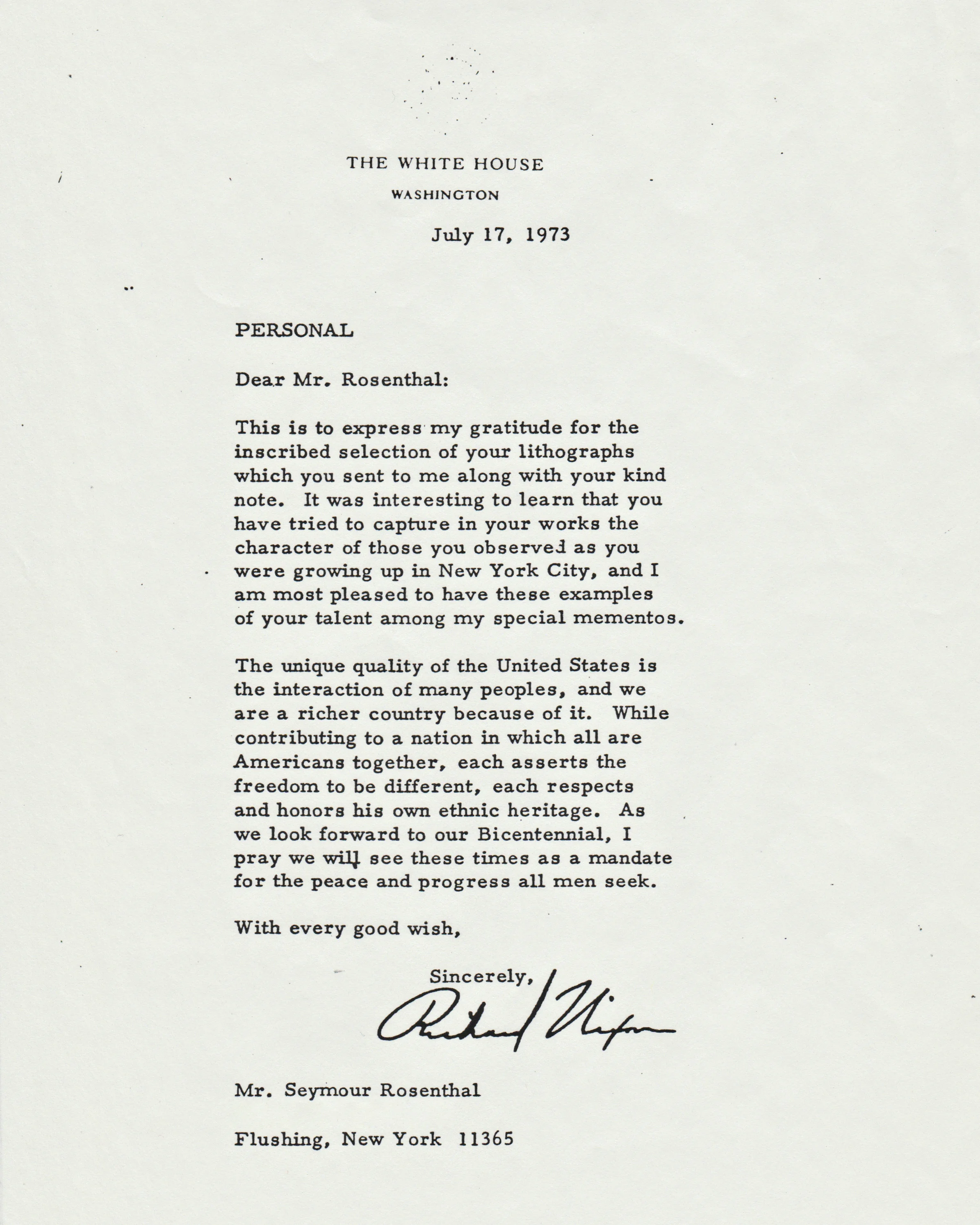 Official White House letter from Sitting President Richard Nixon July 17 , 1973