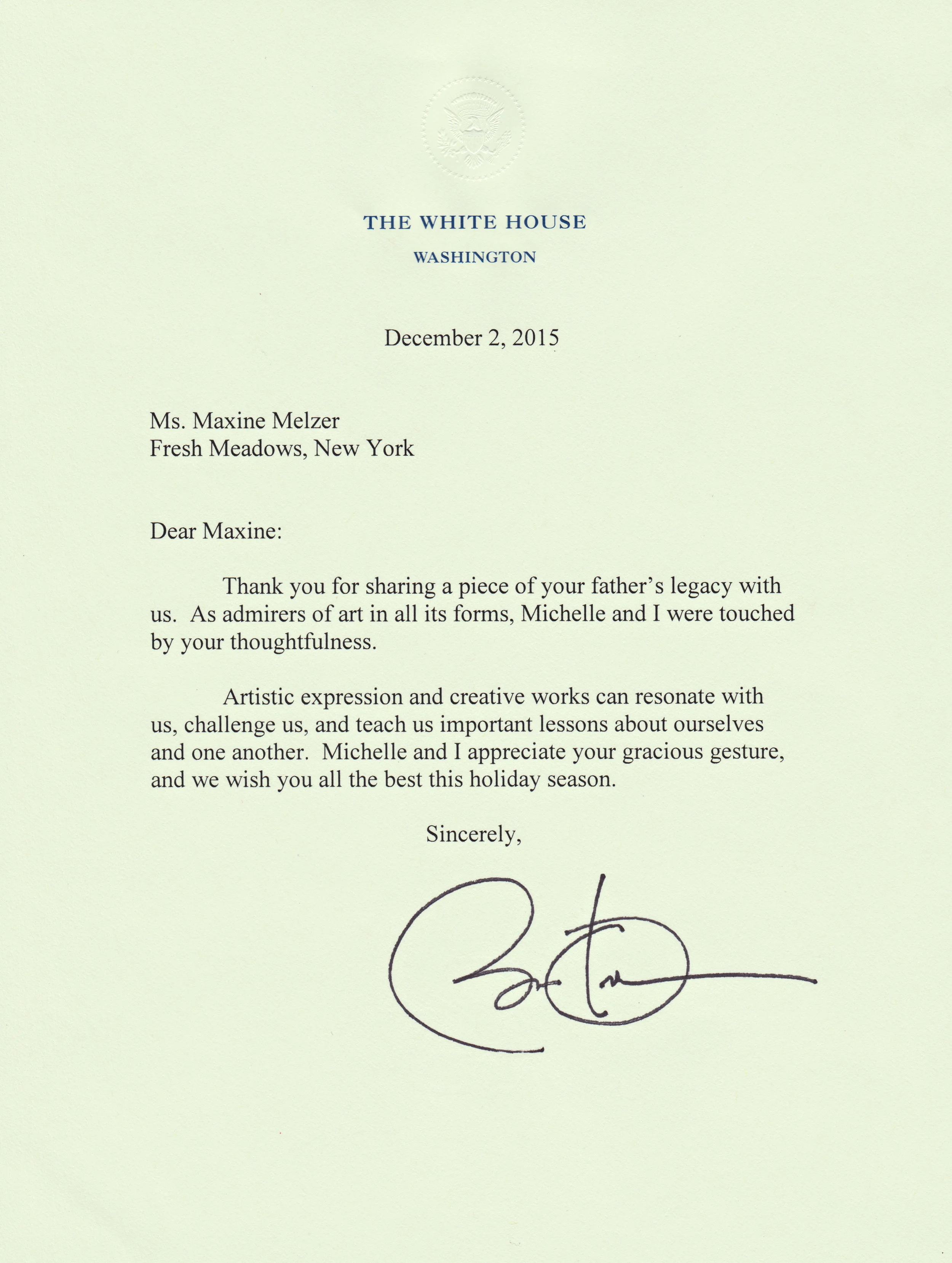 Official White House letter from sitting President Barack Obama to Seymour's daughter Maxine Melzer Dec 2 , 2015
