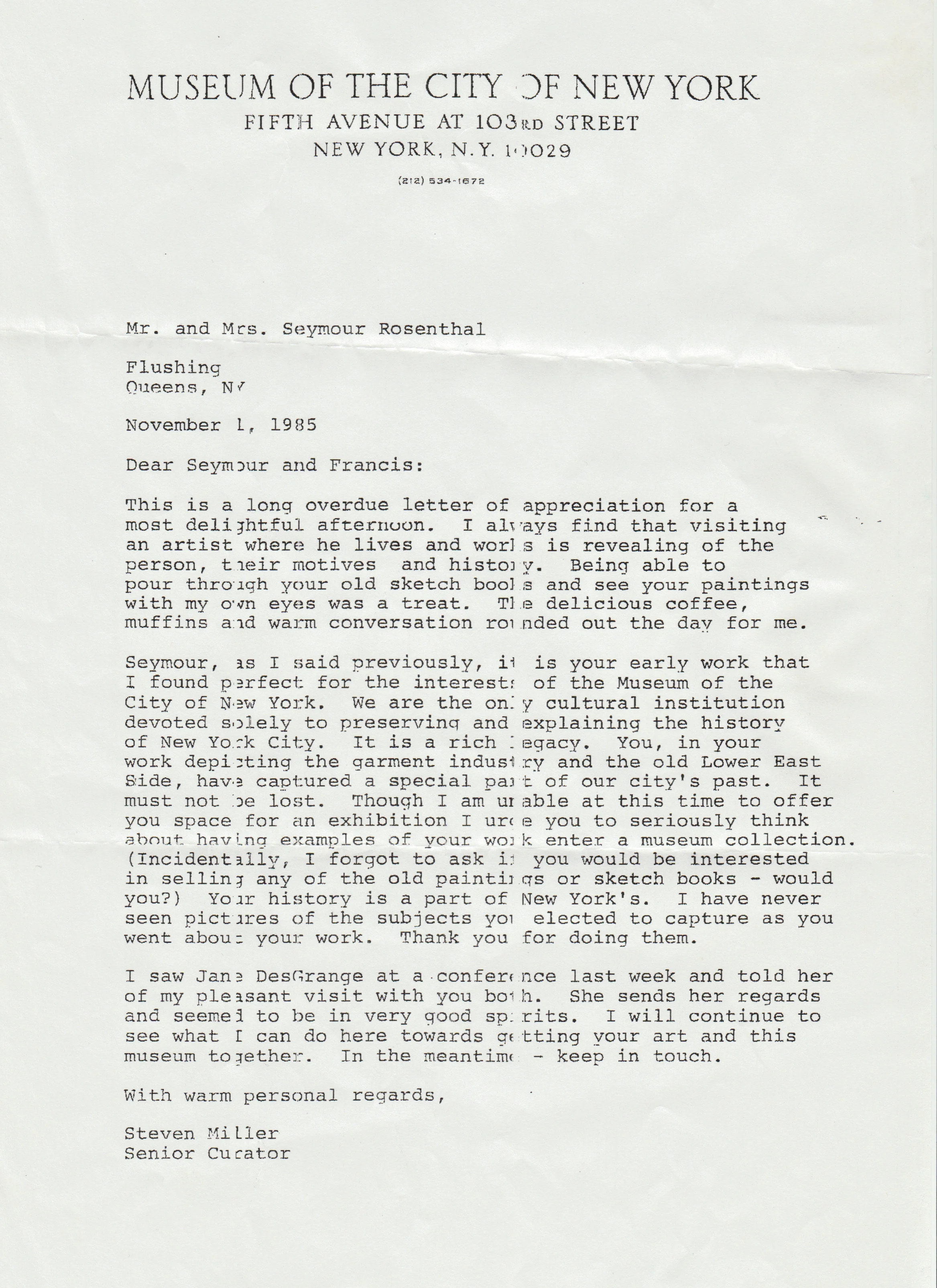 Letter from senior curator Steven Miller - Museum of the City of New York - Nov 1 , 1985