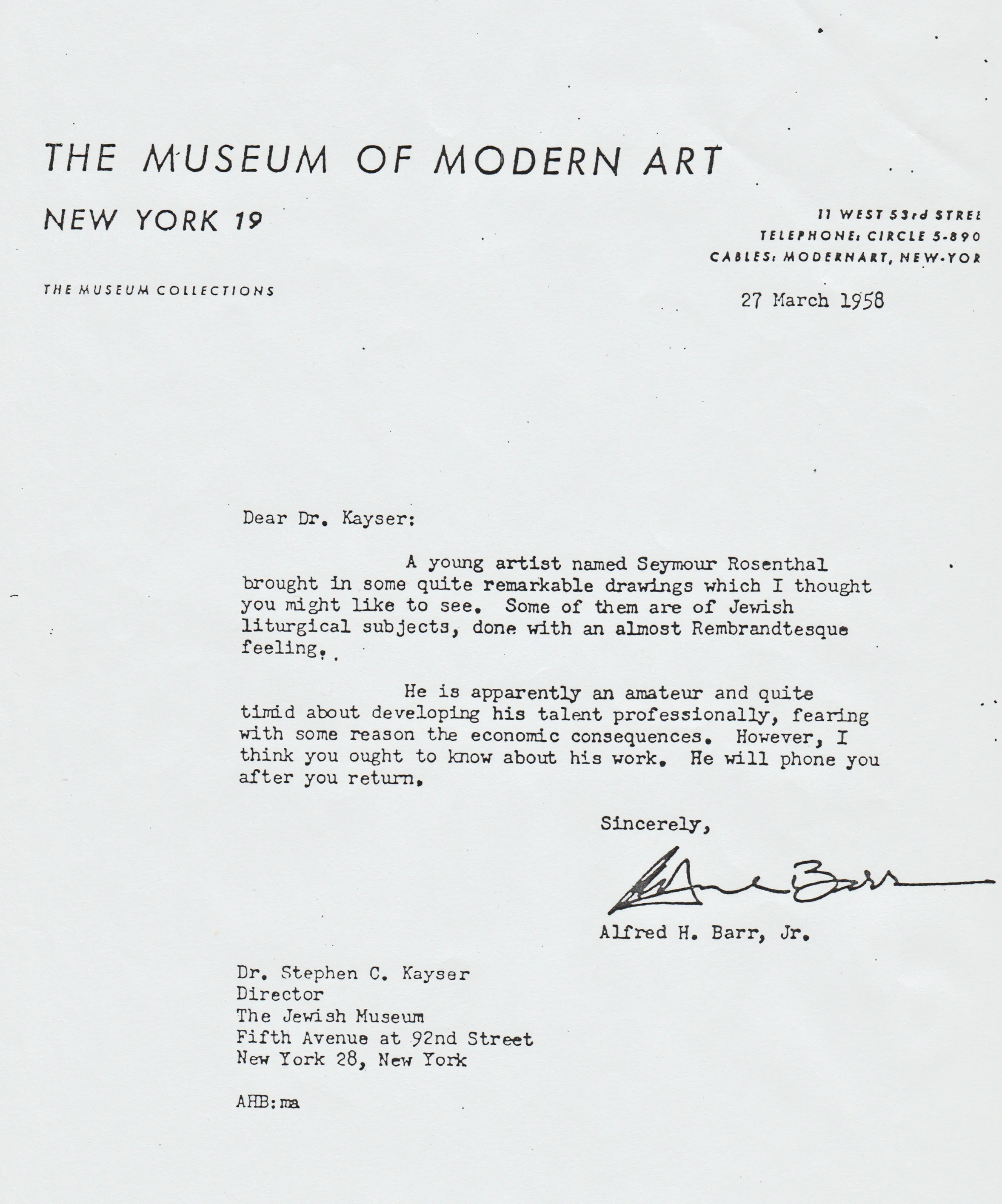 Letter from Alfred H. Barr Jr. founding Director of the Museum of Modern Art to Steven Kayser director of the Jewish Museum Mar 27 , 1958